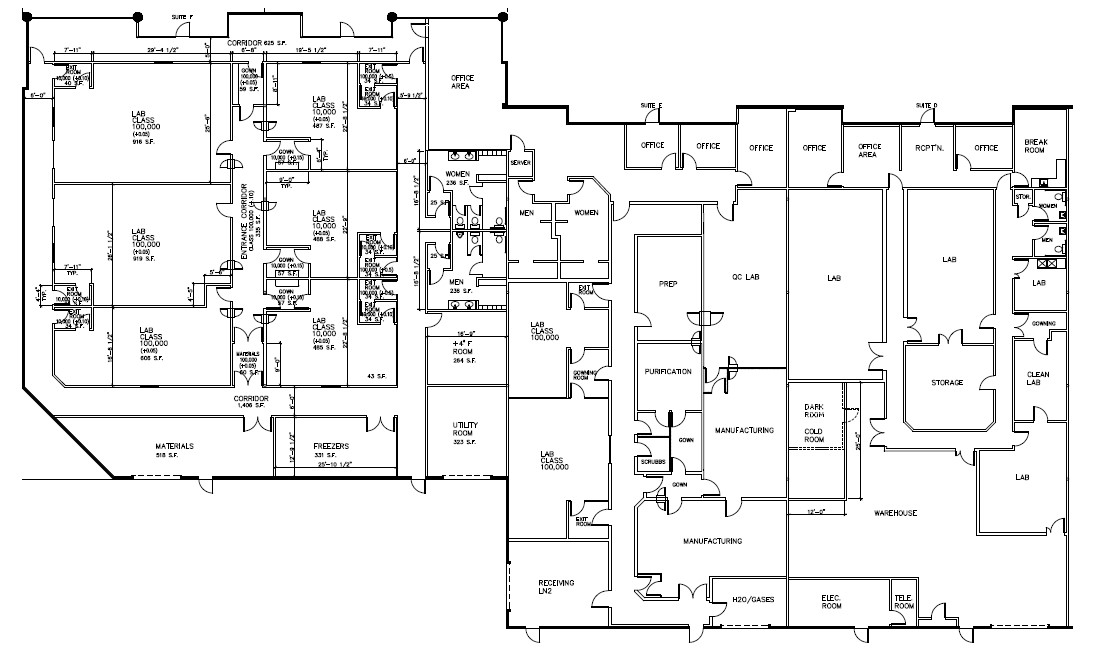 • QC Lab - GMP Materials Warehouse - Cold Room - 4 x Development Labs - Prep Labs - Formulation Lab - WFI/Gas Storage